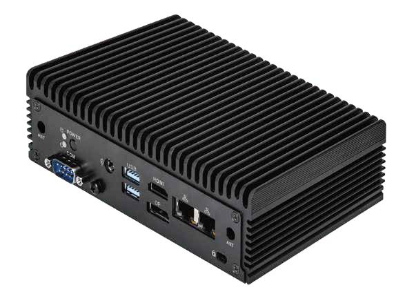 Lüfterloser Embedded-PC mit Intel Core i3-1215UE (Alder Lake-P, 12. Gen), DDR4-3200-Speicher bis 64 GB, Thunderbolt 4, Quad-Display und 2x 2,5G-LAN. Abmessung: 171,8 x 109,45 x 50,05 mm.