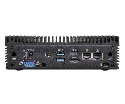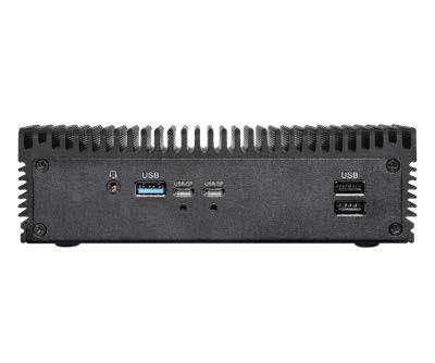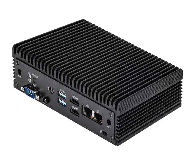 Kompakter lüfterloser Embedded-PC mit Intel Core Ultra 7 155U (Meteor Lake-U), DDR5-5600-Speicher bis 96 GB, Thunderbolt 4, Quad-Display und 2x 2,5G-LAN mit vPro. Abmessung: 171,8 x 109,45 x 50,05 mm.