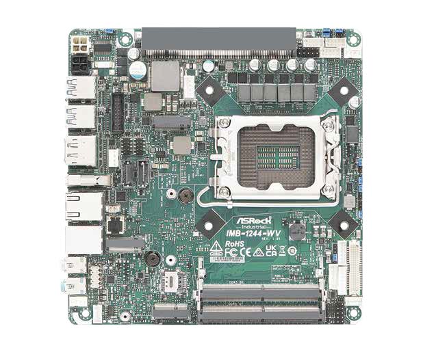 Das ASRock Industrial IMB-1244-WV ist ein besonders flaches Mini-ITX Mainboard (17 x 17 x 2,6 cm) mit Intel Q670 Chipsatz und LGA1700-Sockel. Es unterstützt Intel Core Prozessoren der Serie 2 sowie der 14./13./12. Generation (bis 65 W) und bietet zwei SO-DIMM-Slots für bis zu 96 GB DDR5-RAM. Der PCIe-x16-Gen4-Slot ist als Right-Angle-Variante (liegend) ausgeführt und unterstützt Riser-Cards (x8/x8). 4x USB 3.2 Gen2, 2x USB 3.2 Gen1, 4x USB 2.0, M.2 Key B (4G/5G), M.2 Key E, 2x M.2 Key M und 2x SATA3 ermöglichen umfangreiche Erweiterungen. Quad-Display über 2x HDMI 2.0b, DisplayPort 1.4a sowie separatem LVDS und eDP 1.4b. Intel vPro, VMD RAID 0/1, Intel I226V (2,5 GbE) + I219LM (1 GbE, vPro), GPIO und TPM 2.0 onboard. Stromversorgung über 12–28V DC-Wafer-Stecker.