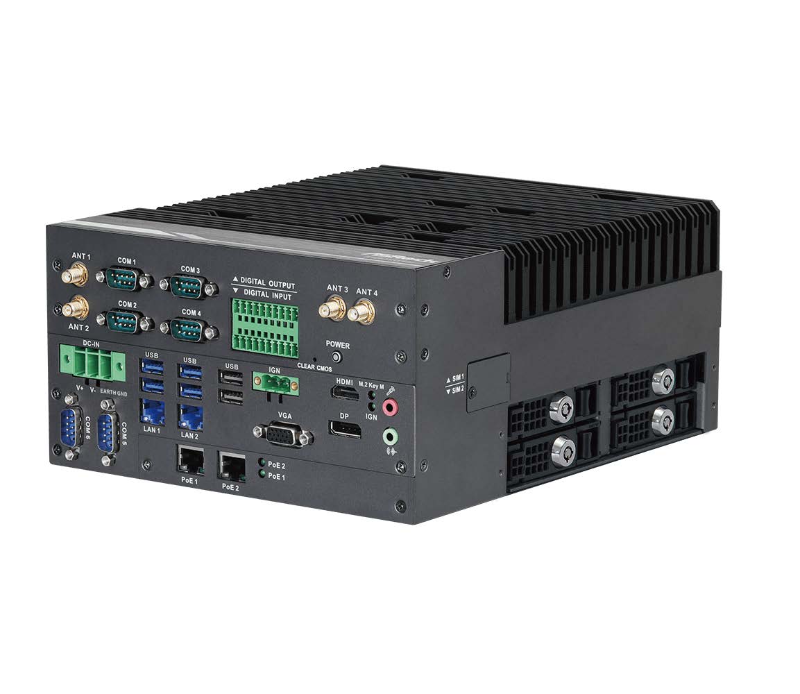 Die iEP-9022E ist eine kompakte und kostengünstige Edge-AIoT-Plattform auf Basis der Intel® 13. Generation Core™-Prozessoren mit Intel® H610-Chipsatz (LGA 1700). Das System bietet zwei DDR4-SO-DIMM-Steckplätze mit bis zu 64 GB (32 GB pro DIMM, Dual Channel 2933 MHz). Zur Konnektivität stehen vier Intel 2,5-GbE-LAN-Ports (davon 2 mit IEEE-802.3af-PoE, max. 15,4 W/Port) bereit. Für Erweiterungen sind ein M.2 Key E (CNVi/PCIe Gen3 x1, WLAN/BT), ein M.2 Key B (PCIe Gen3 x1/USB2.0 für 4G/5G) sowie zwei Mini-PCIe-Slots verfügbar. Zwei USB 3.2 Gen2, zwei USB 3.2 Gen1, zwei USB 2.0-Ports sowie sechs COM-Ports (RS-232/422/485 und RS-232) bieten umfangreiche I/O-Möglichkeiten. Vier SATA3-Ports (RAID 0/1/5/10), ein optionaler CFast-Slot und 8 DI/8 DO ergänzen die Ausstattung. Die Stromversorgung erfolgt über 9–36 V DC mit Zündungssteuerung und 80-V-Surge-Schutz. Der Betriebstemperaturbereich beträgt -40 °C bis 70 °C (35-W-CPU) bzw. -40 °C bis 50 °C (46–65-W-CPU). Windows 10 und Linux werden unterstützt.